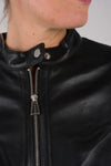 Tässä cafe Racer -tyylisessä takissa on biker-kaulus, jossa on painonappikiinnitys, aksiaalinen vetoketju ja kaksi vetoketjullista sivutaskua. Sen pitkät hihat ovat myös vetoketjullisia. Sen sisävuori on kevyt ja siinä on raglantasku.