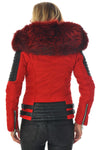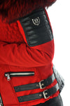 Koostuu punaisesta polyesterista, jossa on mustaa karitsannahkaa tikattuja sisäosia käsivarsissa, selän alaosassa ja taskuissa.