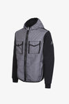 Löydämme hybridihupun, jossa on kauluksen toiminto ja joka on varustettu kiristyslenkillä. Vaatteet jongloivat jatkuvasti mustan ja harmaan välillä. Hopeanväristä metallisuljinta ympäröi koristeellinen reunus. musta koko pituudeltaan, sopii pitkien hihojen mustaan ja erottuu keskiosan harmaan kanssa. 2 rintataskua on kiinnitetty. Napsauttavat läpät ja niissä on mustat reunat harmaalla taustalla. Horspistin tyylitelty H-kirjain on vasemmassa käsivarressa, kun taas oikealla sivulla on logomerkki. Hihansuut ovat vyötäröllä. joustonauha.