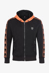 Sen oranssissa hupussa on joustava kiristysnyöri ja se erottuu selästä. upea keskiosan mustalla värillä. Pitkien hihojen reunukset ja flokoidut kuviot ovat myös oransseja. Vyötärö ja hihojen päät on koristeltu leveällä resorinauhalla, joka varmistaa hyvän istuvuuden. Molemmilla sivuilla on kaksi vetoketjullista taskua, ja merkin metalliset medaljongit on pinnoitettu. vasemmassa rinnassa.
