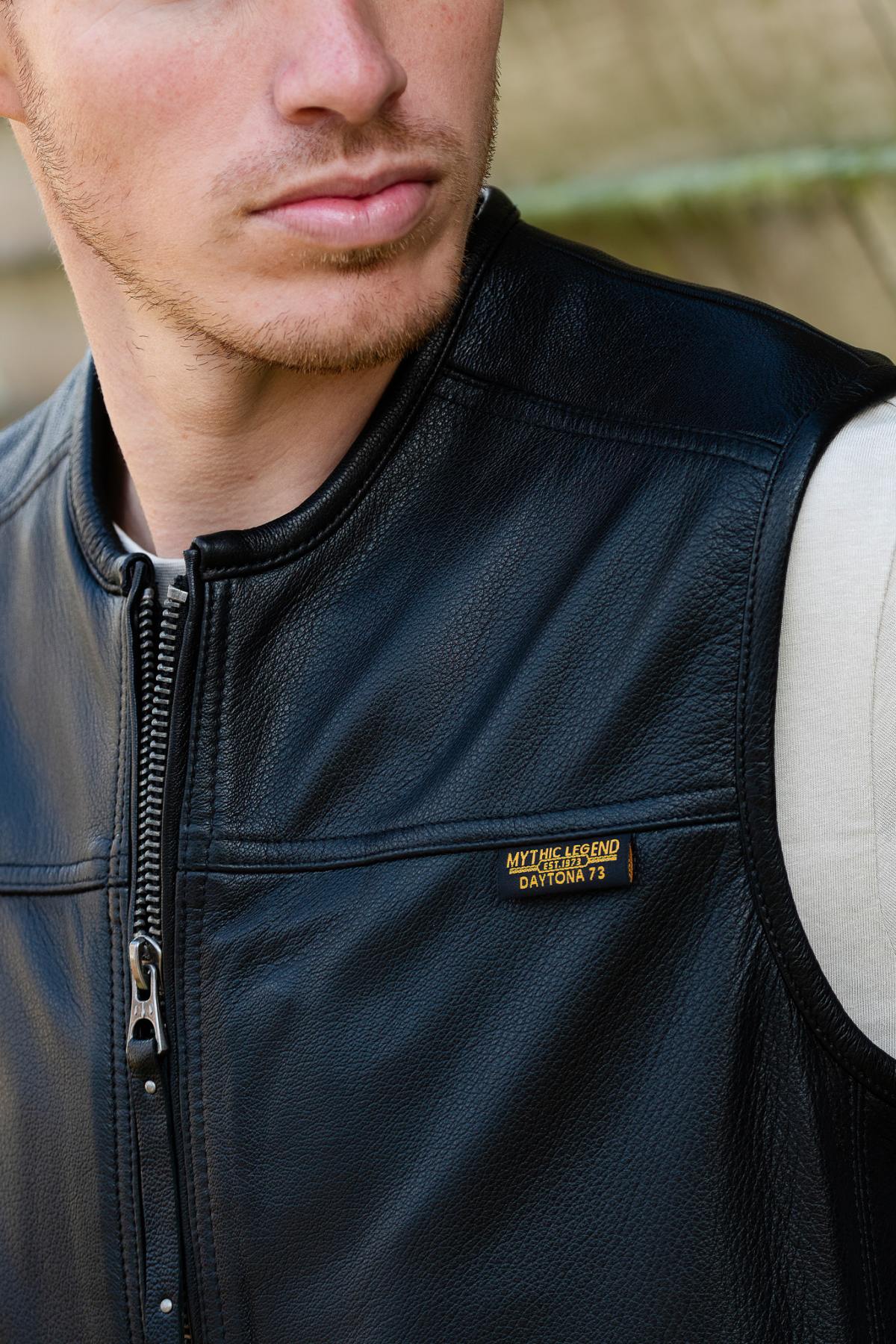 This model features a central closure with three snap buttons, adding a touch of originality to its clean design. Two discreet side pockets provide both functionality and style. The regular fit ensures optimal comfort and suits all body types. Goat leather, known for its durability and suppleness, gives the vest a slightly grained texture and a patinated finish – a testament to Daytona's craftsmanship. At the back, a silver buckle allows for waist adjustment to perfectly structure the silhouette.