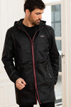 Väriltään musta, tässä takissa on suuri huppu ja se sulkeutuu akselia pitkin pitkällä metallisella vetoketjulla. Keskipitkä, siinä on joustava resorinauha pitkien hihojen päissä, mikä varmistaa hyvän istuvuuden. Keskisuljin on koristeltu punaisilla reunoilla, jotka luovat mukavan kontrastin. Kaksi vetoketjullista taskua koristavat kummallakin sivulla, ja toinen vetoketjullinen tasku on harmaassa sisävuoressa.