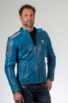 Tutustu Legend Motorsin miesten pyöräilijän kaulustakkiin, LM178 DUFF SHEEP CROWN OCEAN BLUE. Tämä sininen lampaannahkainen nahkatakki, joka on lisensoitu 24 tunnin Le Mansiin, yhdistää pyöräilijän tyylin ja ajattoman eleganssin.