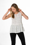 Suora malli, vyötäröltä rypytetty baski, jossa levenevä alaosa.