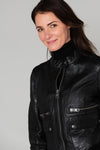 Nahka on käytännöllinen ja trendikäs. Todiste tällä Italiassa valmistetulla ELECTRA NOIR 501 naisten takilla. à Oakwood-brändin lampaannahkainen pohja.