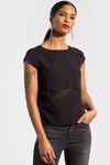 Musta väri, joka sopii täydellisesti ommeltujen pitsi-osien kanssa. Edessä ja takana V-pääntie, tässä puserossa on lyhyet hihat ja sivuhalkiot. Edessä kaulus on pyöreä, kun taas'à takana se on erittäin uppoava V, mikä antaa vaikutelman paljaasta selästä.