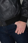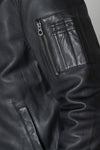 Tämä musta takki suljetaan aksiaalisella metallivetoketjulla, ja se on varustettu aksiaalisella metallivetoketjulla. kaksi sivutaskua ja pieni vetoketjullinen tasku vasemmassa hihassa. Sisäpuoli on valmistettu hienosta puuvillavuoresta, jonka molemmilla puolilla on vetoketju. Kaulus, pääty Pitkissä hihoissa ja pohjassa on puuvillainen ribbirakenne, joka lisää käyttäjälleen ripauksen uskollisuutta. klassisesta bomber-takista.