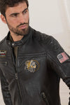 Sen normaali leikkaus välittää miehisyyttä. ja vahva luonne. Rakastamme nahan poikkeuksellista patinaa, joka paranee ajan myötä. Peloton pyöräilijän tyyli korostuu tässä mallissa. Löydämme upseerikaulus, joka sulkeutuu hopeisella neppariksella. Ulkopuolella on 3 vetoketjullista taskua, joista 1 rintatasku ja 2 alempaa viistoa taskua. Kontrastinen khakinvärinen vuori sisältää taskut edessä. vetoketju, neppari ja puhelimeen. Se on valmistettu puuvillasta. Vintage-tyyliset brodeeratut paikat merkitsevät takin mekaanista maailmaa.