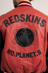Tämä lampaannahkainen takki on kevyt ja hieno. Nahkatyöt ovat korkealaatuisia. sekä paksu että joustava, mikä tarjoaa poikkeuksellista mukavuutta ja suojaa. Rakastamme sitä nalletyylistään, joka sisältää ajattomia koodeja 50 vuoden ajan. Kauluksesta, takaa löytyy siis raidalliset ja joustavat resorireunat. vyötäröllä ja hihansuissa, jotka muistuttavat amerikkalaisia lukiotakkeja. Takana on nyökkäys yhteisvastuuseen ja kirjailtuja kirjoituksia REDSKINS ja NO PLANET B. Rinnassa oleva jättiläinen Redskins R vahvistaa tuotteen aitoutta. mallista.