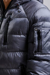 Harmaalla värillään tämä anorakki on pehmustettu nahalla. ja siinä on korkeasta kauluksesta nouseva huppu joustavalla kiristysnyörillä. Pitkien hihojen päissä on tarrakiinnitys, jonka avulla niitä voi tarvittaessa kiristää. Molemmilla sivuilla on kaksi vetoketjullista taskua, toisella puolella vetoketjullinen tasku. rintakehä ja viimeinen hieno tasku vasemmassa hihassa.