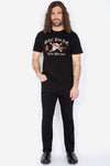 Se on miesten t-paita, jota rakastamme läpinäkymättömästä mustasta väristään, joka on merkitty visuaalisella logolla erittäin trendikkäässä keskiaikaisessa kalligrafiassa. Musta tausta korostaa silmiinpistävää kuvaa ja lisää kapinallisen sävelen, joka kiehtoo. Miehistön kaula on moderni ja vahvistettu. uurretulla ompeleella. Lyhyet hihat antavat sinun olettaa maskuliinisuuttasi. ja hänen miehisyytensä. Tiheä punainen nauha merkitsee kauluksen sisäpuolta ja tuo malliin vahvistusta ja tyylikkyyttä. Tuotemerkki valkoisin kirjaimin erottuu ihanteellisesti t-paidan mustaa vasten.