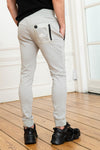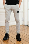 Väriltään harmaa, näissä housuissa on joustava vyötärönauha, joka on vahvistettu mustalla kiristysnyörillä. Jalkojen päät ovat myös uurretut ja antavat jalkoihin porkkanaleikkauksen. tämä housu. Molemmilla sivuilla on kaksi vetoketjullista taskua ja toinen tasku on kiinnitetty taakse. takaosa. Tässä takataskussa on merkin nimi ja logo valkoisina, ja vasempaan lahkeeseen on ommeltu merkkituotemerkkinen musta medaljonki.