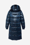 Deze extra lange donsjas, met zijn vaste kap en zijn metallic afwerkingen, combineert stijl en functionaliteit. Het is gemaakt van nylon en heeft een oversized snit voor maximaal comfort en toch elegant. Het is uitgerust met twee buiten- en twee binnenzakken met ritssluiting, allemaal gevoerd met fleece voor extra warmte. De polyestervulling zorgt voor een effectieve isolatie, terwijl de ritsen aan de onderkant een perfecte verstelbaarheid mogelijk maken.