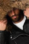 De CARLTON BLACK NATURAL COLLAR is van zwart polyester met inzetstukken van lamsleer, ook zwart, het bont op de vaste capuchon is naturelkleurig en de ritsen en drukknopen op de jas zijn zilverkleurig.