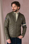 Het Gary Sheep Crown Khaki jack is gemaakt van glad kakikleurig schapenleer, voelt zacht aan en heeft een verfijnde uitstraling. Het onderscheidt zich door de bikerkraag met drukknoop, de witte en blauwe horizontale banden op de linkerarm en de 'Steve McQueen'-patches die een vleugje authenticiteit toevoegen. Met zijn slimfit-snit is hij perfect passend voor een moderne en gepolijste look. Het heeft drie buitenzakken met ritssluiting, waarvan twee aan de zijkant en één op de borst, en twee binnenzakken voor praktische opbergruimte. De beige katoenen binnenvoering is voorzien van een Steve McQueen-print, een eerbetoon aan het bioscoop- en race-icoon.