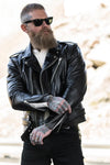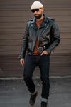 Men’s black cowhide biker jacket: the Tombstone by Master Supply Co. embodies raw elegance and unmistakably masculine style. Its regular fit and all-season construction make it an ideal choice for those who value authentic, long-lasting pieces.