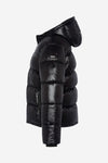 De COLUMBUS BLACK is een gewatteerd donsjack van zwart nylon, ontworpen om optimale bescherming te bieden tegen de kou. Dit sportkledingmodel heeft een capuchon en zakken met ritssluiting en valt op door zijn glanzende uiterlijk en het iconische logo op de mouw. De gezwollen snit voegt zeker een vleugje trend toe aan je wintergarderobe. Met een nylon voering, een binnenzak en twee buitenzakken combineert hij functionaliteit en stijl.