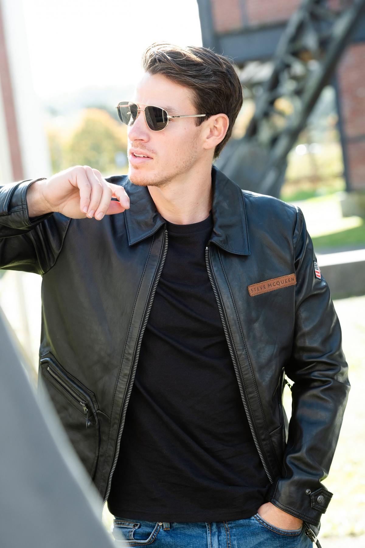 The JOSHUA BLACK jacket by Classic Legend Motors, officially licensed by Steve McQueen, is an iconic piece for men seeking a timeless style. Crafted from black sheepskin leather, it offers elegance and versatility, perfect for all seasons.