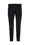 Deze broek met een zwarte contrasterende kleur van 70% katoen en 30% polyester. door een band met zilveropdruk langs elk been.