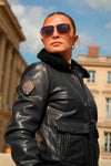 Trouw aan het merk. In navolging van de traditie van de beroemde bomberjacks heeft dit zwarte jack een lange metalen axiale ritssluiting en geribde banden aan de onderkant en de uiteinden van de lange mouwen. De grote overhemdkraag is versierd met afneembaar wit imitatieschapenbont. De vier zijzakken. En hoe kunnen we de Patrouille de France-badge vergeten? Hij is aan de zijkant van de rechtermouw geplateerd.