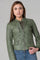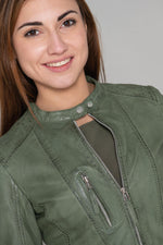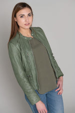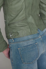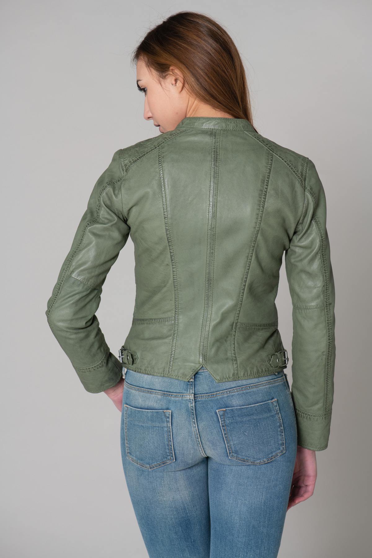 Soepel en licht, dit schapenleer heeft een gepatineerde afwerking. en heeft een verouderde uitstraling. De ritsen geven een dynamische, bikerlook. De split aan de onderkant van de achterkant en de aantreklipjes aan de achterkant passen perfect bij de vorm van de heupen.