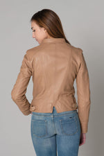 De inzetstukken die op de schouders, de taille en de uiteinden van de lange mouwen zijn genaaid, geven een mooie afwerking. Dit jasje, terwijl de kleine split aan de de onderkant van de achterkant geeft het geheel een vrouwelijke touch. De kraag is versierd met een bandje met drukknoop. Dit bikerkraagjack sluit in de as dankzij een ritssluiting. een metalen ritssluiting met een vleugje fantasie zoals die aan de ritssluitingen van de zijzakken en de ritssluitingen van de zijzakken. de zijzak op de borst.
