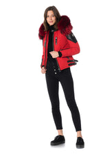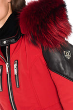 Dit rode polyester model is verfraaid met een hoodie. inzetstukken in zwart lamsleer.