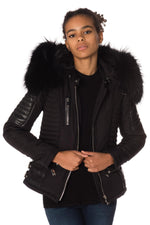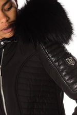 Nieuw uit de collectie 2018: badge op de linkermouw met een uniek serienummer en een leren riempje om de drukknopen te verbergen zodra het bont is verwijderd.