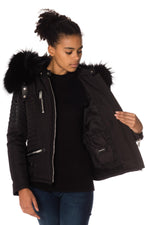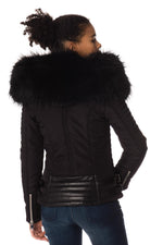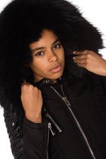 Capuchon afneembaar door middel van ritssluiting, deze is versierd met imposant en subliem zwart wasbeerbont, dat zelf afneembaar is door middel van drukknopen.
