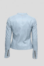 Lichtblauw van kleur, deze jas is uitgerust met een slanke pasvorm. een bikerhalsband met verstelbare riem. drukknoop die geboorte geeft; een lange axiale metalen ritssluiting die voor sluiting zorgt. De taille heeft ook een gespband. drukknop. De schouders zijn gewatteerd en de zijkanten zijn versierd met twee verticale zakken met ritssluiting. De uiteinden van de lange mouwen zijn eveneens voorzien van een ritssluiting en zijn verstevigd met drukknopen.