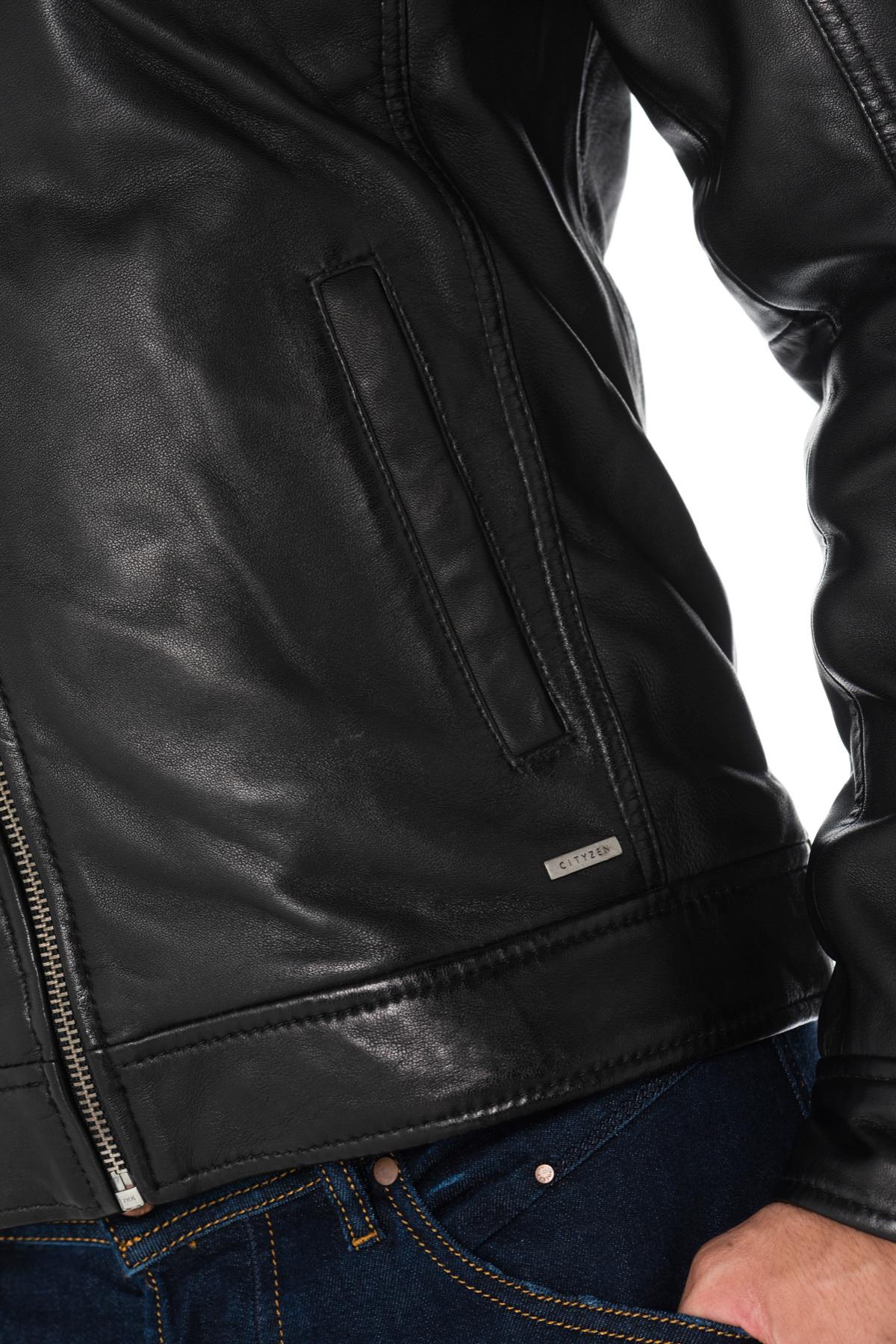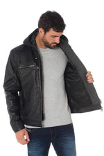 Bikerkraag met drukknoop en capuchon met trekkoord gemonteerd op een afneembare bekleding met ritssluiting.