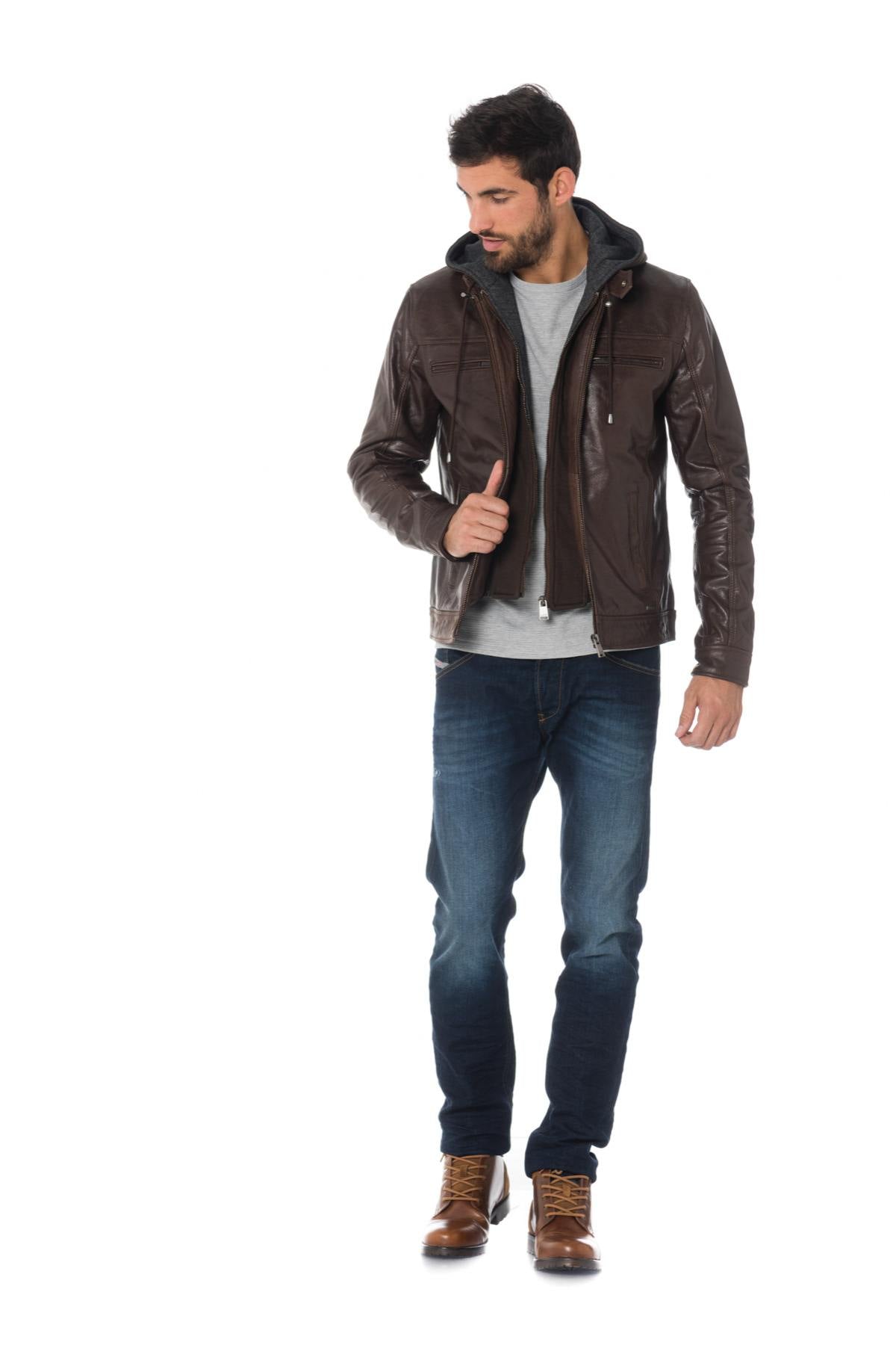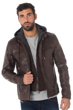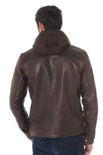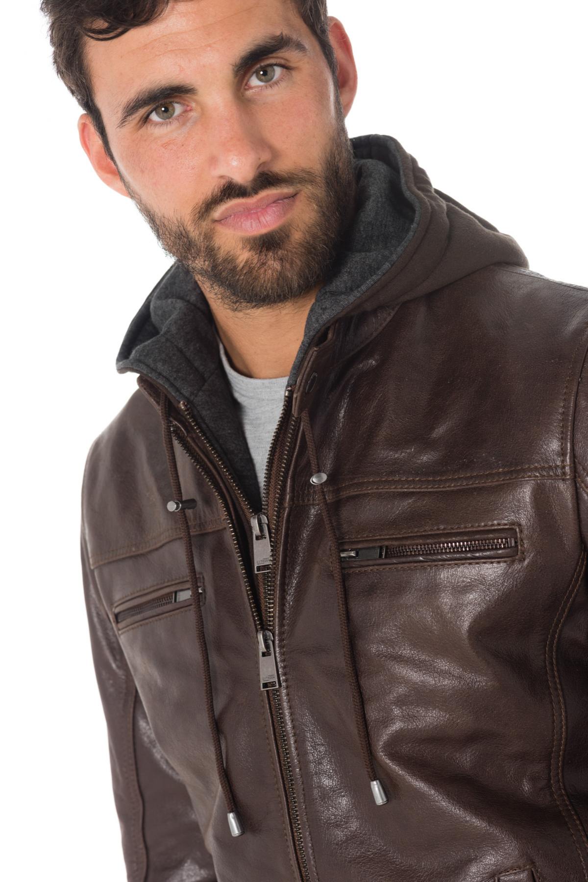 Dit buffellederen jack heeft een capuchon met sweatshirt-effect gemonteerd op een afneembare ritssluiting.