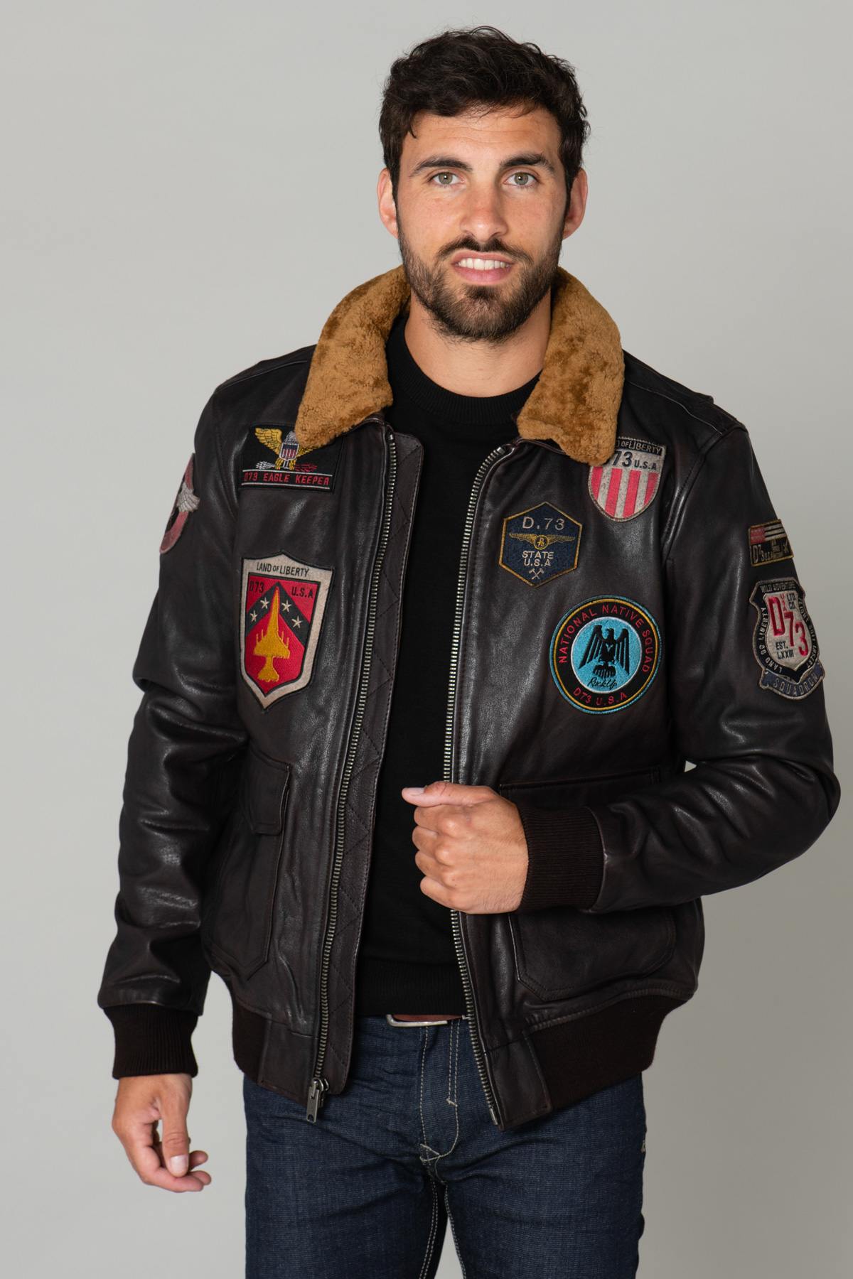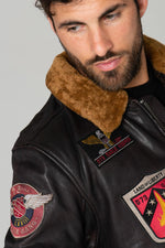 Dit model biedt leer dat u zal verrassen met zijn finesse, zachtheid en lichtheid. De bruine schapenvachtkraag onderstreept de pilotenstijl. Het staat bovenaan een klassieke leren halsband. De robuuste centrale sluiting wordt gecombineerd met grote zakken met drukknoopsluiting, versierd met handige zakken aan de zijkanten. Je kunt je handen erin steken en je klas behouden, terwijl je ze warm houdt bij koud weer. Aan de mouwen en aan de achterkant zijn geribbelde randen aanwezig. maat voor totaal comfort en waterdichtheid. optimaal. De bruine voering heeft stijlvolle zakken met ritssluiting, perfect voor het opbergen van je persoonlijke spullen. Naast het logo van het bekende merk Daytona herinneren talrijke stijlvol geborduurde patches aan de hoogtijdagen van de luchtpiloten uit de Eerste Wereldoorlog.