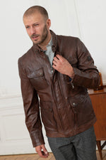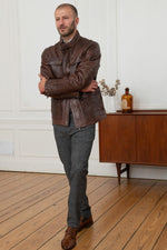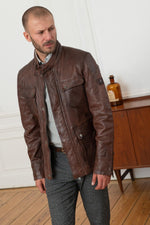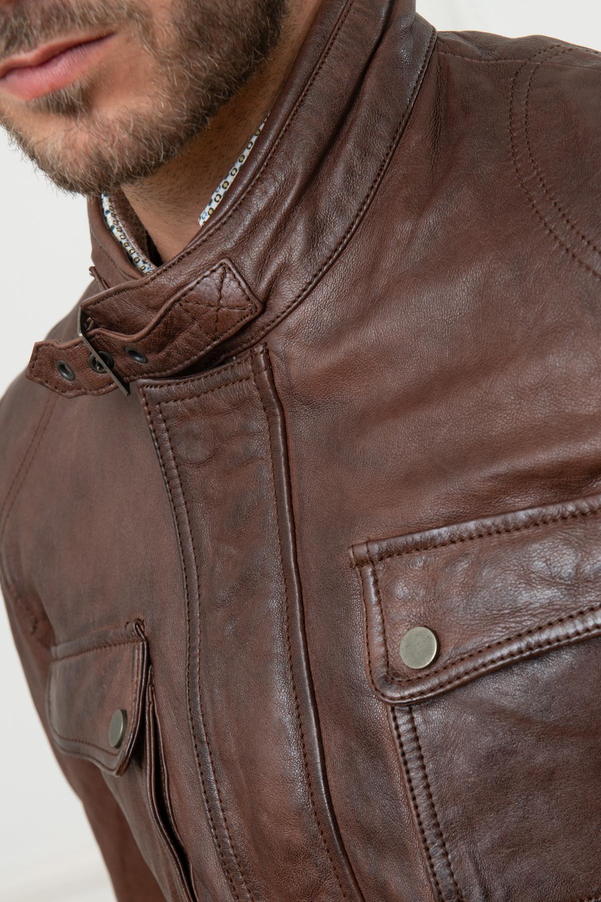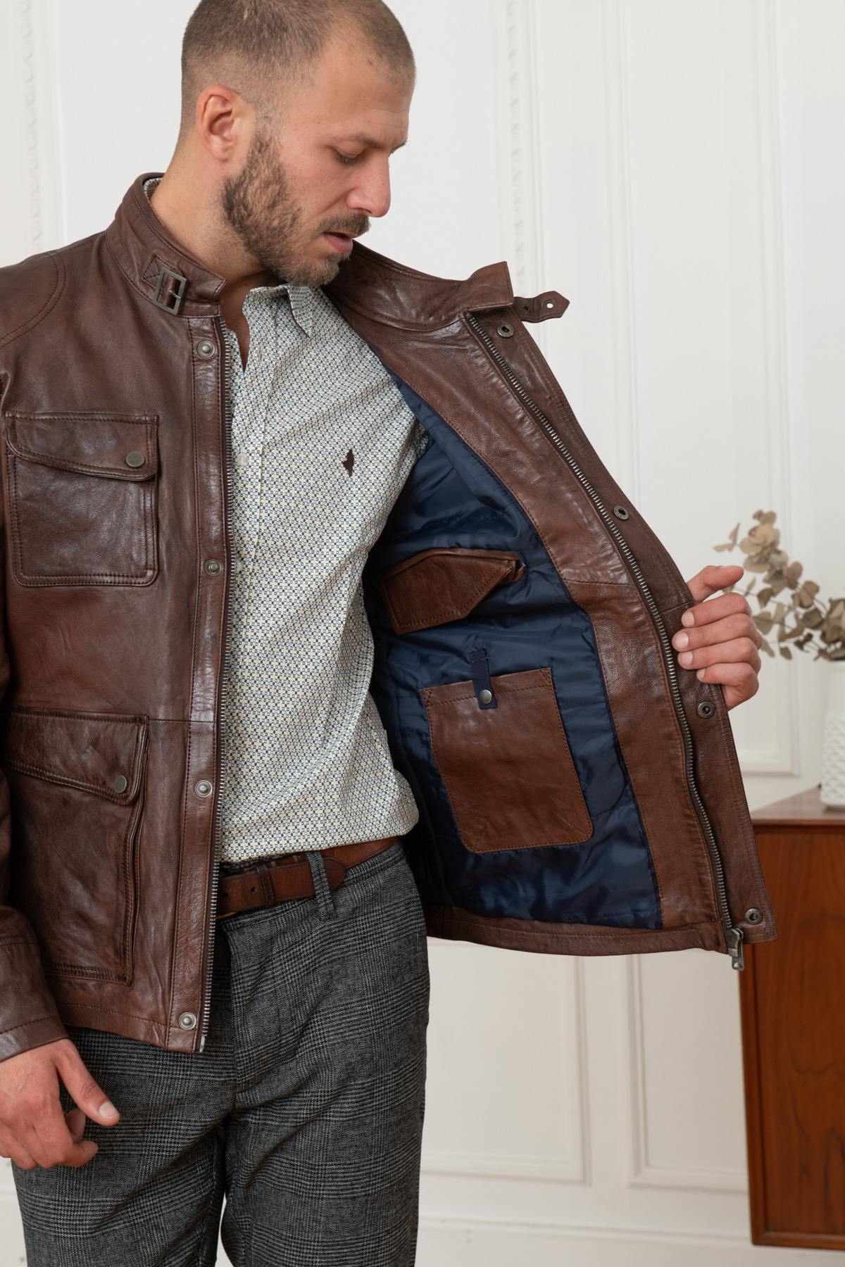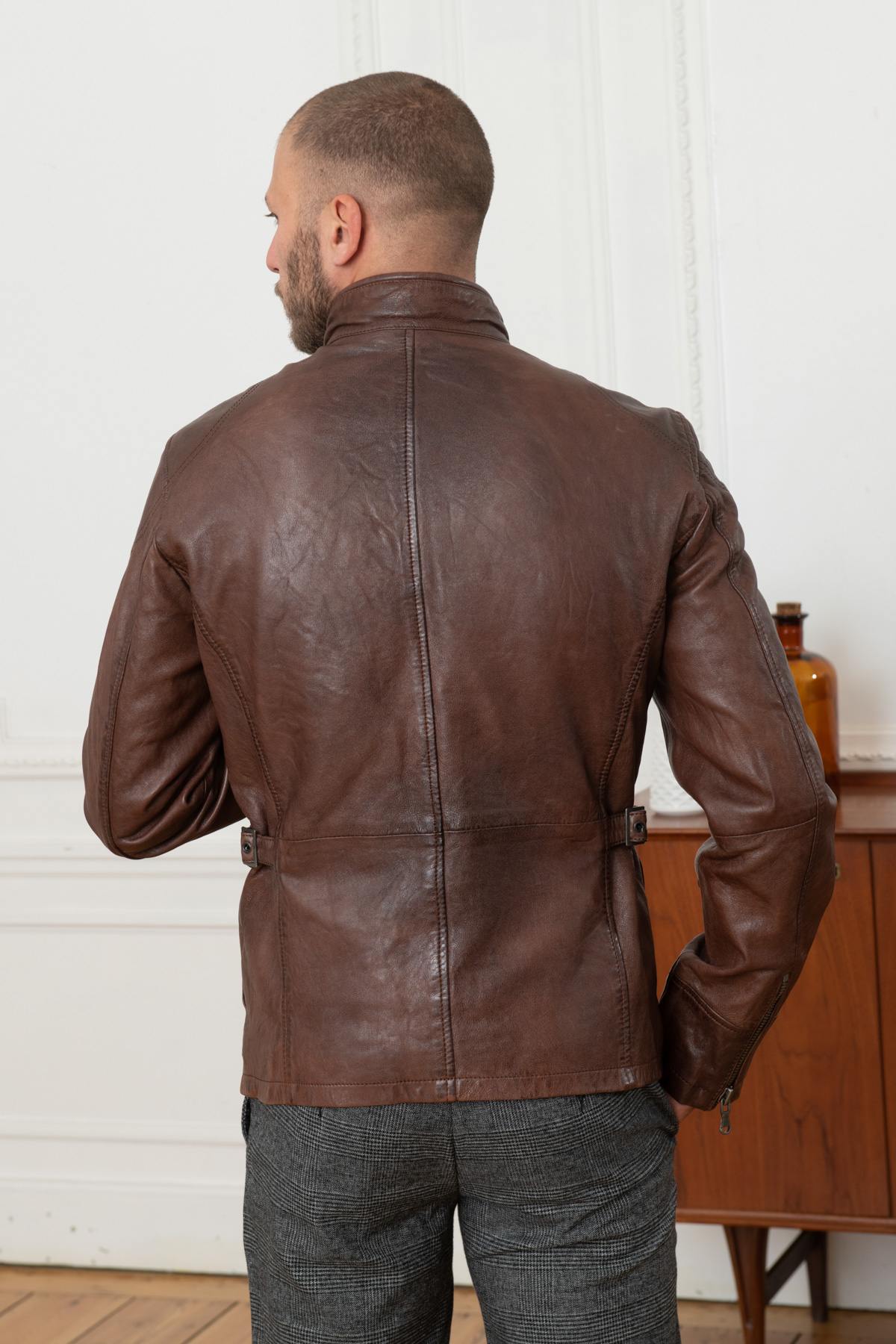 Het merk MCS herziet de leren jas op de mooiste manier en presenteert zijn herenjas MFCUIR_P012 213 CHOCOLAT. Een kruising tussen een bikerkraag en een A2-jas gemaakt in Italië. van schapenleer en voorgesteld in een normale snit.