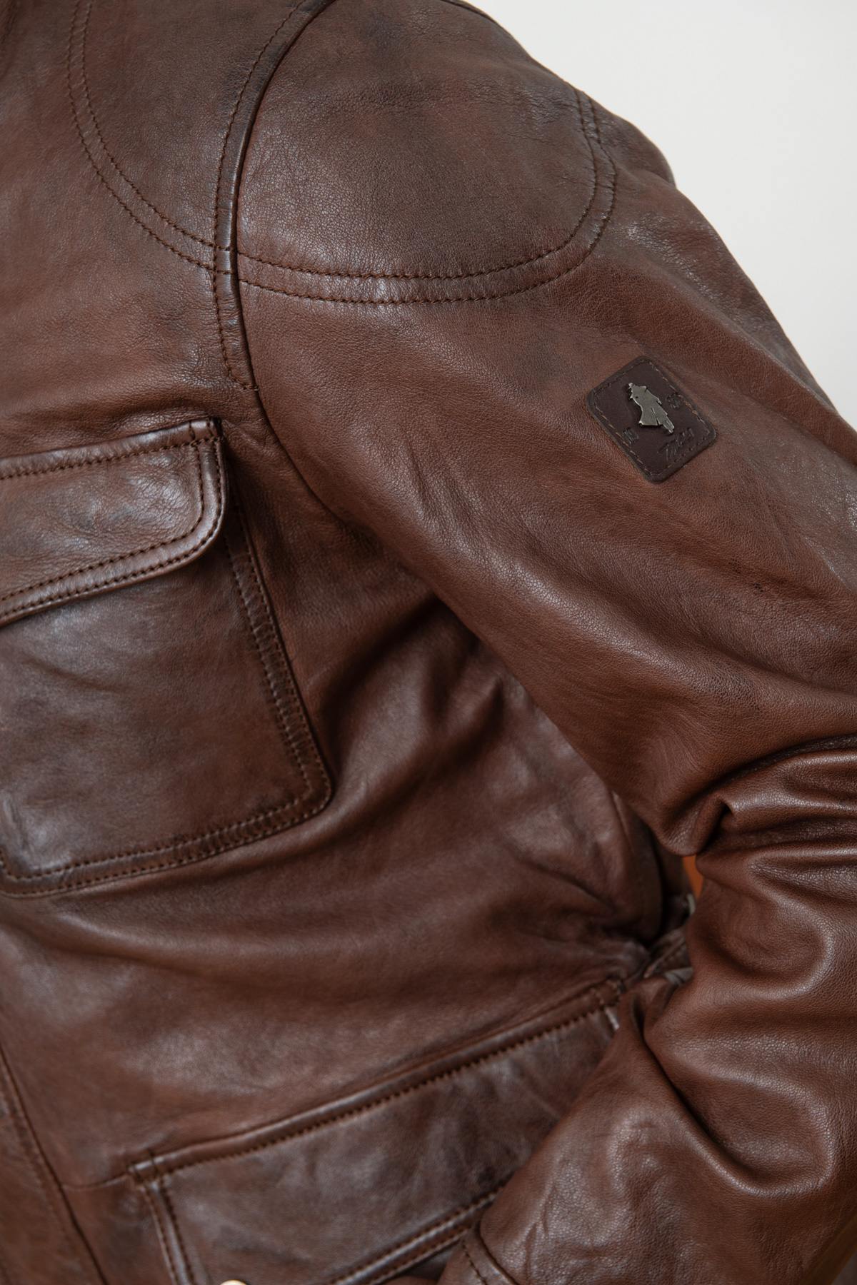 Bruin van kleur, uiteraard voorzien van een motorkraag met kraag. een riempje en een metalen gesp die aanleiding geeft tot een knoopsluiting met ritssluiting en manchetten. drukknopen. Ook de uiteinden van de lange mouwen zijn voorzien van een ritssluiting. Vier zakken met ritssluiting Aan elke kant zijn flappen met knopen geplaatst. borst en zijkanten. De blauwe binnenvoering heeft ook zakken. Dankzij de twee verstelbare bandjes kun je de tailleomvang subtiel aanpassen. metalen gesp in de taille genaaid. Het merklogo is verguld. op de linkermouw.