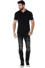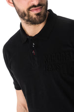 Zwarte kleur met ton-sur-ton inscriptie in reliëf op de borst.