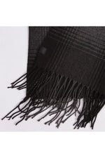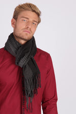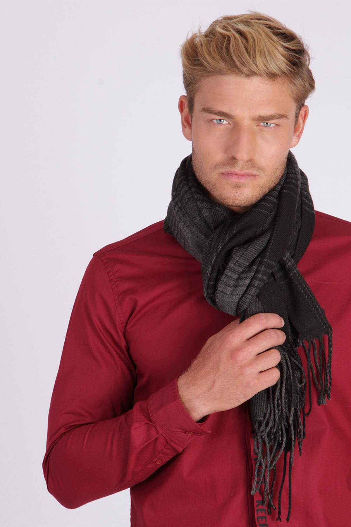 Zwart van kleur, het heeft grijze strepen die het een bewezen charme geven. Dankzij de lengte kun je hem gemakkelijk om je nek wikkelen, zoals je wilt. Het merklogo is verguld. discreet aan een van de uiteinden vóór het rafelige gedeelte.
