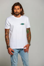 In zijn witte kleur is dit T-shirt eenvoudig met zijn ronde hals en korte mouwen. Ernaast een kleine print. De linkerkant van de borst is aanwezig in een dambordpatroon. Op de achterkant is een grotere print geflockt die een autorace uit 1966 benadrukt.