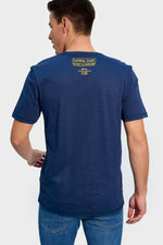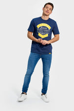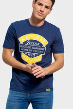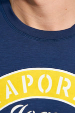 Val voor de zijkant van het t-shirt. klassiek en retro van dit essentiële onderdeel van je herengarderobe. Het spel tussen blauw en geel geeft het een zekere charme en een unieke trendy uitstraling.