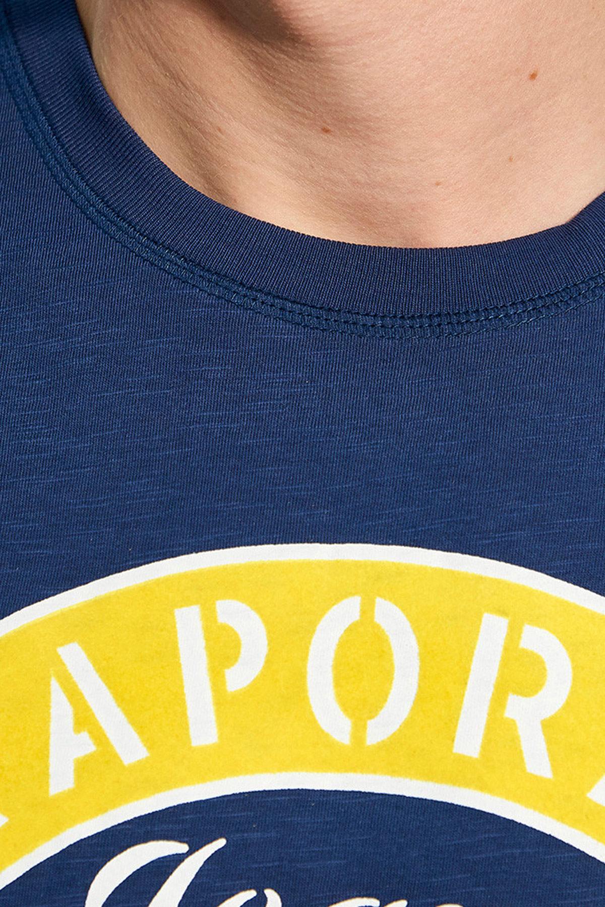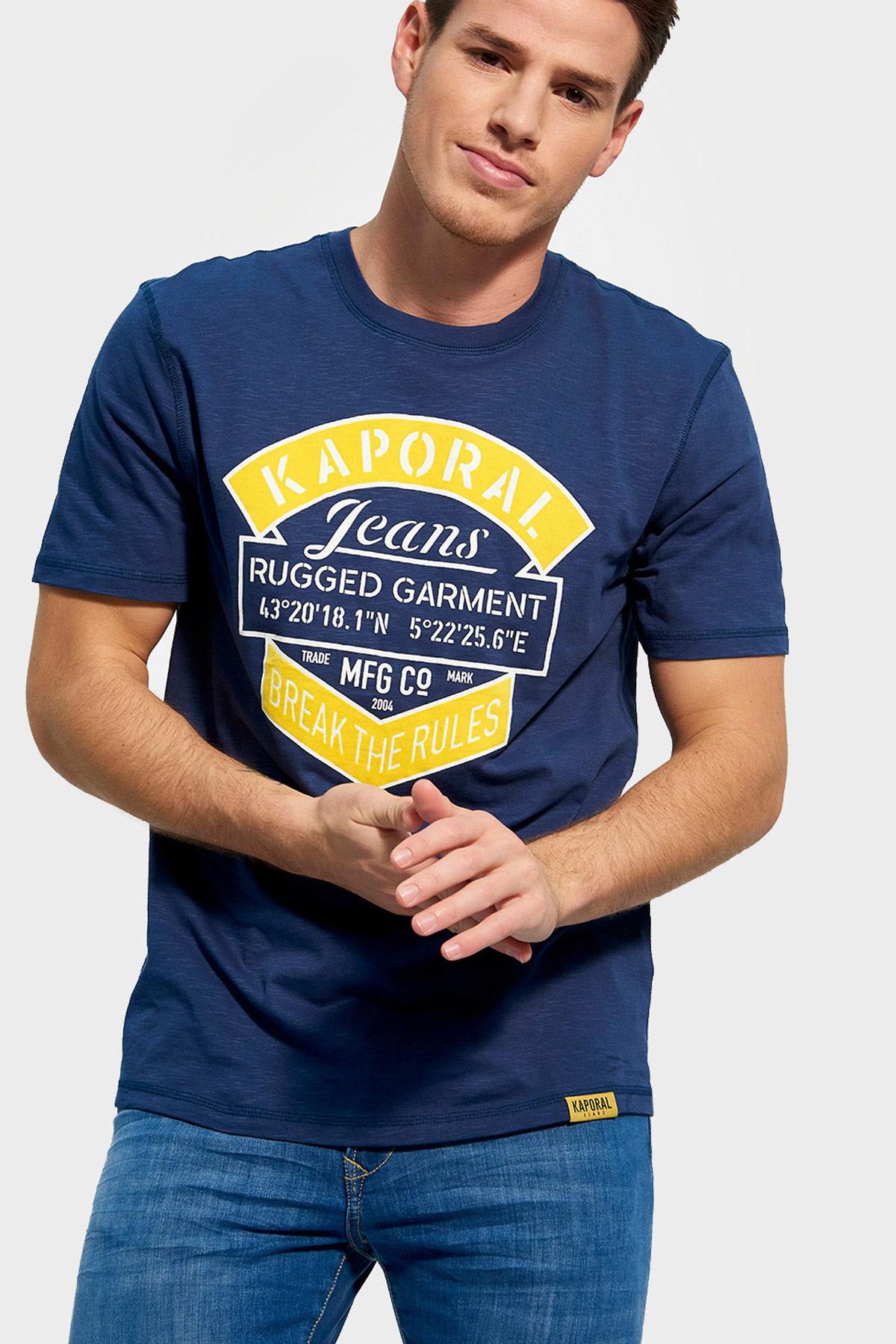 De zijkant is gemaakt van 100% katoen. sober maar eigenzinnig van het model trekt onze aandacht. Het universele blauw is ook een belangrijk pluspunt. De kraag is rond en de mouwen zijn kort. Het oppervlak is voorzien van duurzame en nette stiksels. Zijkant In detail zien we een gedrukt patroon. geel en wit met een zeer trendy streetstyle. De visual vormt een Kaporal-designlogo met een deel van de witte letters op een gele achtergrond. Het merklogo wordt ook weergegeven in gele inscripties die op de achterkant in de nek zijn gedrukt. In een hoek aan de onderkant van het t-shirt is een geel Kaporal-label genaaid om de authenticiteit ervan te garanderen.