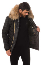 Vaste capuchon, versierd met prachtig wasbeerbont, afneembaar door druk. In de zak van de jas zit een leren band waarmee je de druk kunt verbergen zodra het bont is verwijderd.