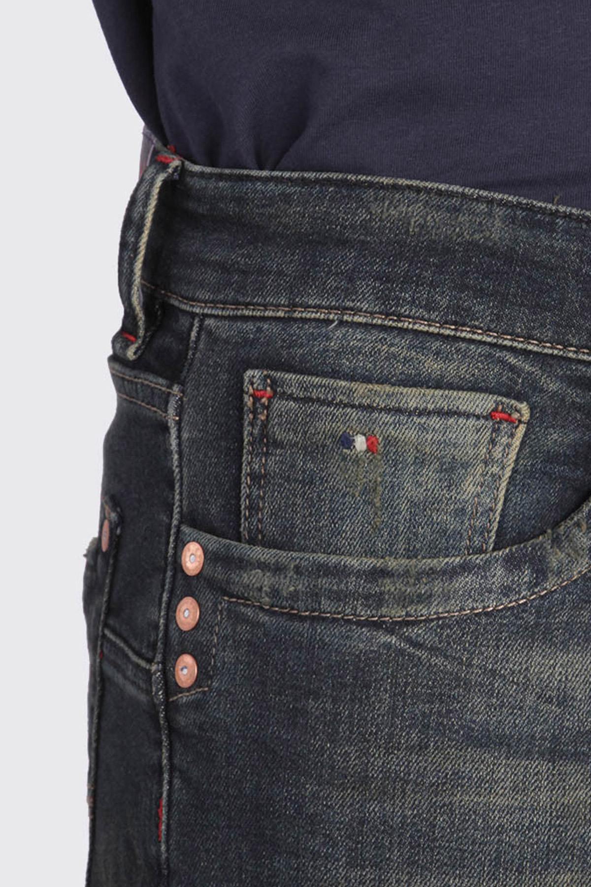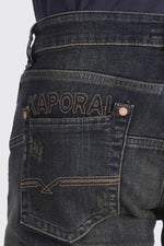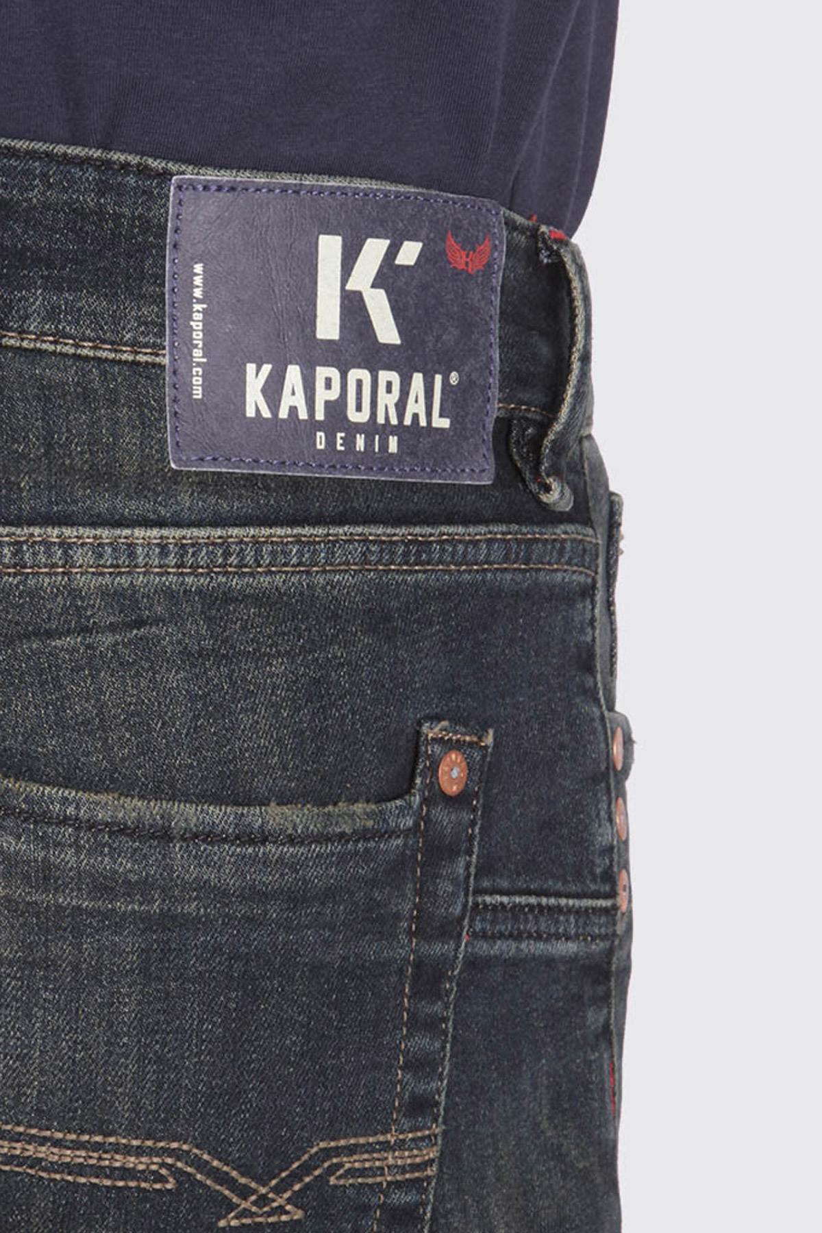 Deze jeans is gemaakt van 99% katoen en 1% elastaan. Ze hebben vijf zakken, waaronder een ticketzakje met een driekleurig label. Ze zijn uitgerust met een knoopsluiting en voorzien van de letters van het bord op een van de achterzakken, evenals een patch met het Kaporal-logo. Het merk is ook in reliëf op de knopen en discreet op de rand van de sluiting gestempeld, als garantie voor authenticiteit.