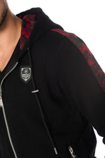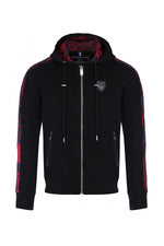 Dit zwarte sweatshirt met rits wordt geaccentueerd door prachtige strepen aan de voorkant. rood bedrukt.