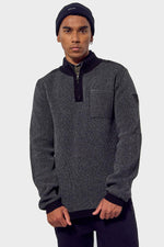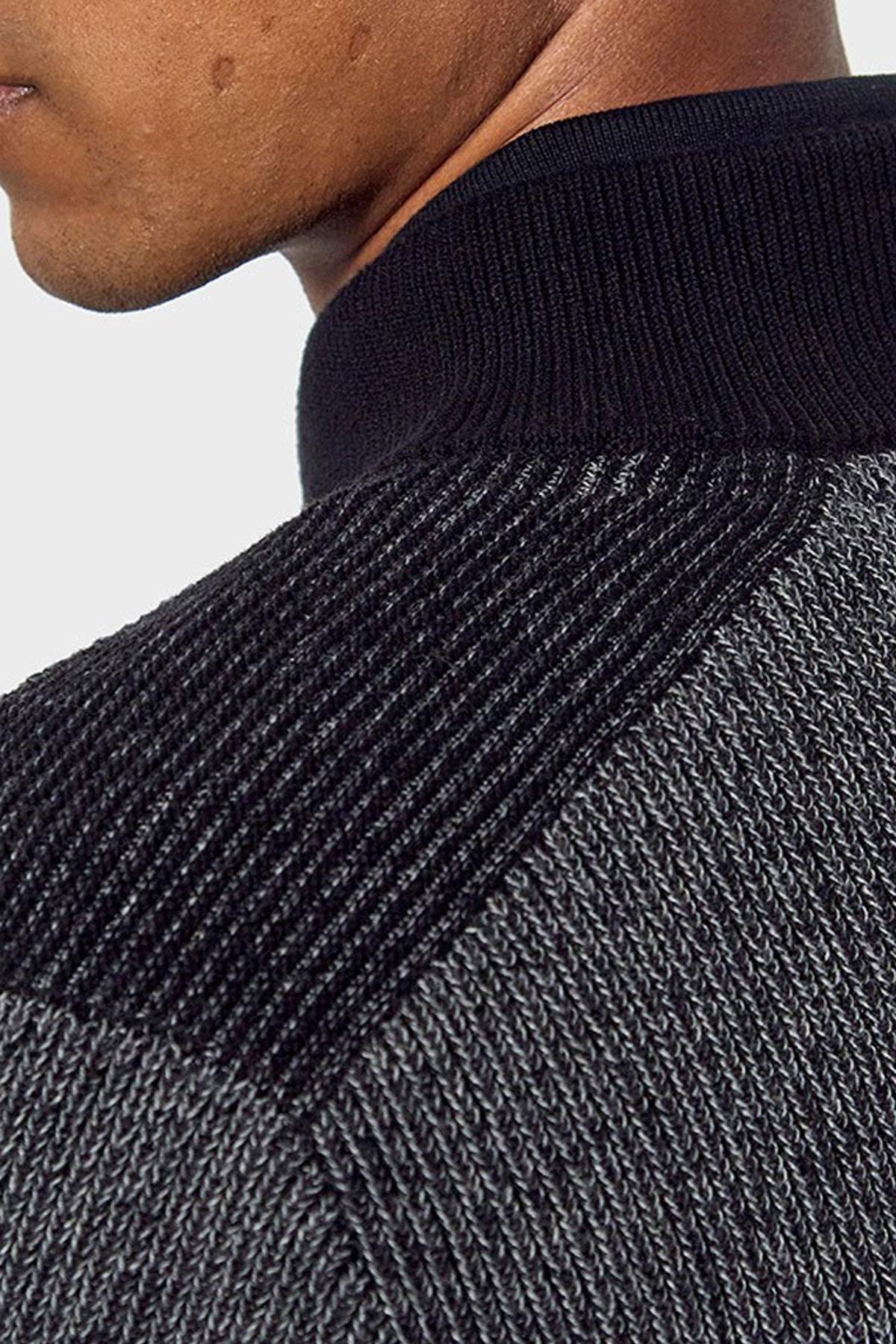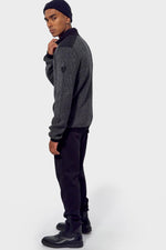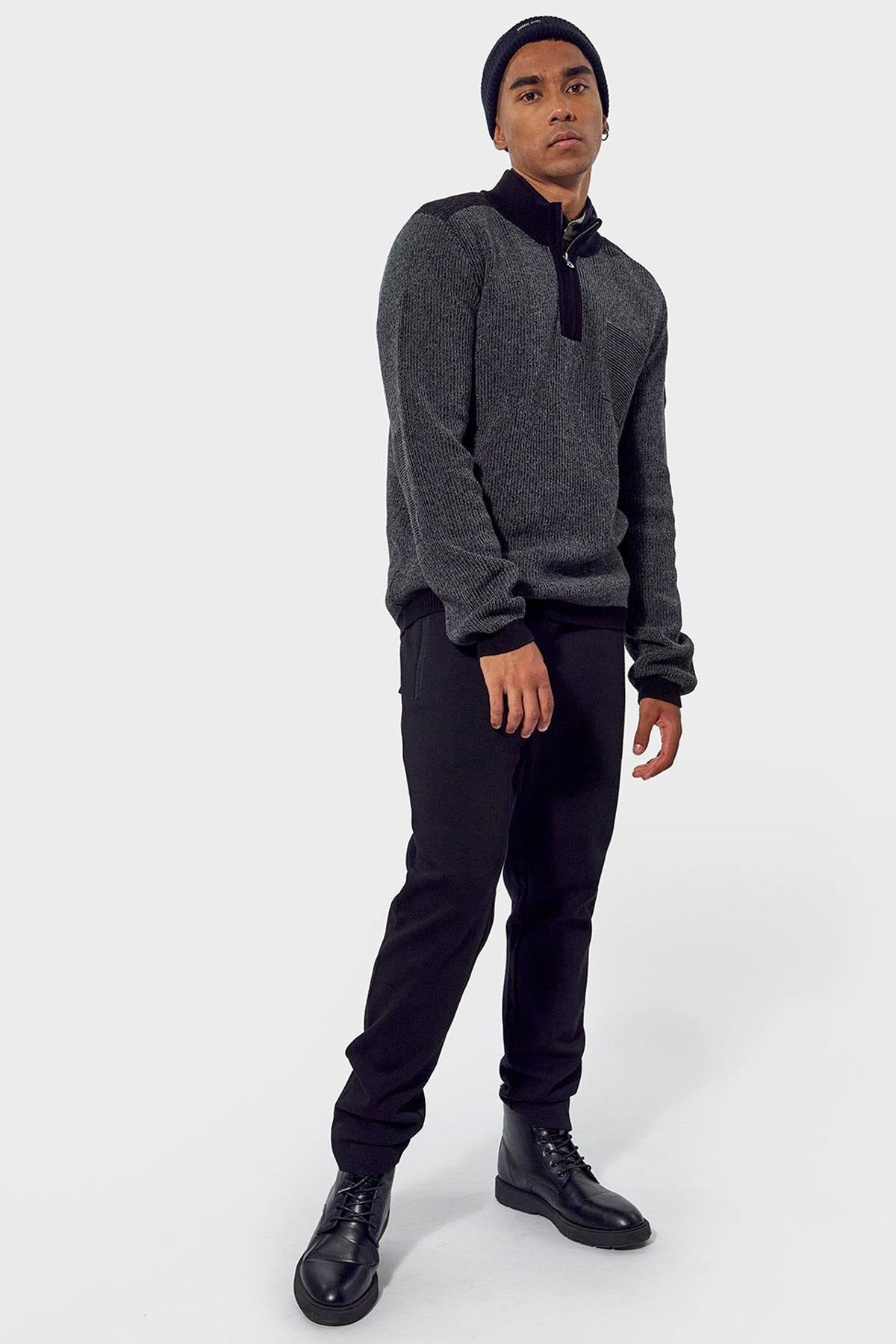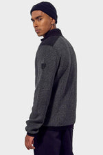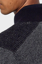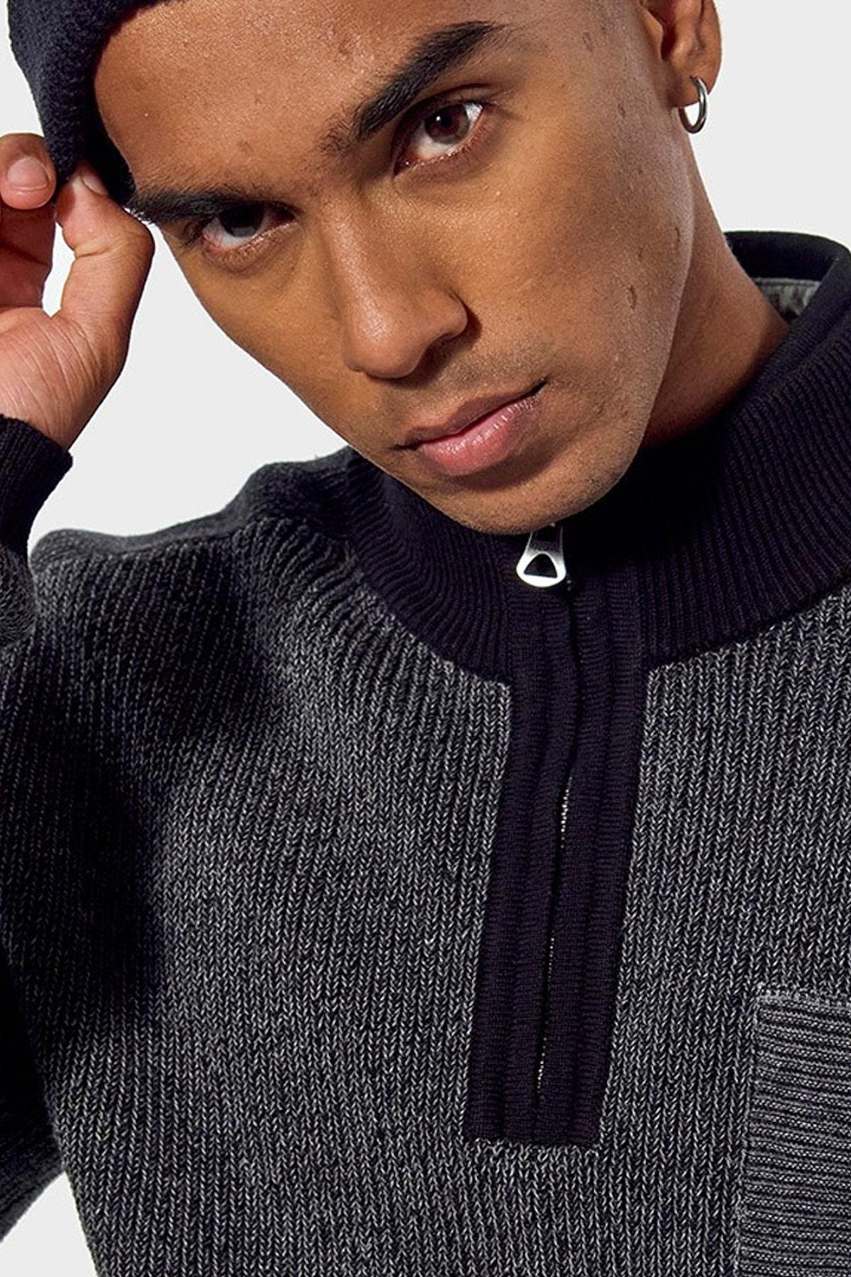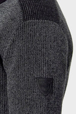 De kraag is hoog en heeft een hoge kraag. met een ritssluiting die doorloopt tot aan de bovenkant. De mouwen zijn lang. Dit is een gebreide trui met sobere en aantrekkelijke kleuren. Het dikke materiaal zorgt voor totaal comfort. Op de schouders zijn decoratieve inzetstukken aanwezig en de elleboogbeschermers zijn ontworpen om een succesvol kleurcontrast te bieden. De borst is versierd met een valse zak. Aandacht voor detail is gemarkeerd. met contrasterende randen aan de kraag, manchetten en taille.
