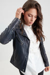 Discover the OLYMPE LAMB VITA NAVY women's perfecto jacket by Rose Garden, made from navy blue vegetable-tanned lamb leather, perfect for all seasons.