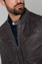 De jas heeft een klassieke bikerkraag en een onweerstaanbare, nauwsluitende stijl. . Het leer heeft een gepatineerd effect; licht en goede eigenschappen qua flexibiliteit. Wat de halsband betreft, deze heeft een aanpassingsdruk. De sluiting biedt een robuuste en gecentreerde ritssluiting. Ritsen zijn ook aanwezig op de borst, onderzakken, binnenzakken en manchetten, voor een rebelse bikerlook. De afwerkingen zijn bewerkt en de kleur is een echte favoriet.