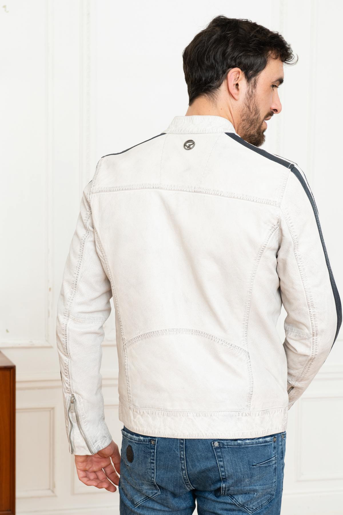 Wit van kleur, dit jasje is mooi verfraaid. langs de mouwen met marineblauwe banden die voor een prachtig contrast zorgen. Het sluit met een lange axiale metalen ritssluiting die aanleiding geeft tot de ritssluiting. een bikerkraag die met drukknopen gesloten kan worden. Opgezette zijzak. De borst, zijkanten en uiteinden van de lange mouwen zijn voorzien van een ritssluiting. Er is een merklogo boven het zijvak aangebracht. borst.