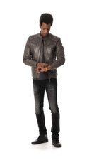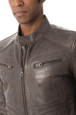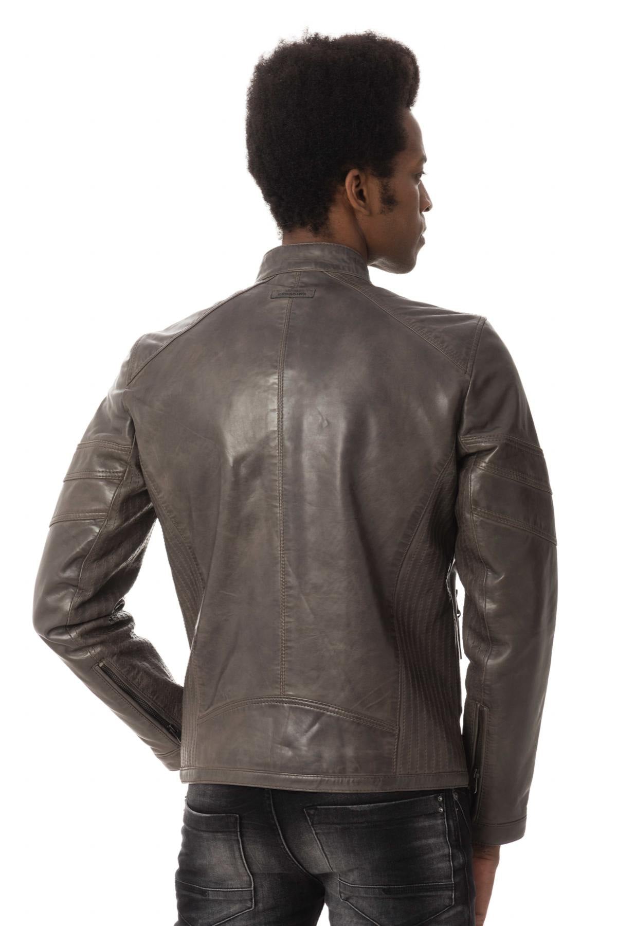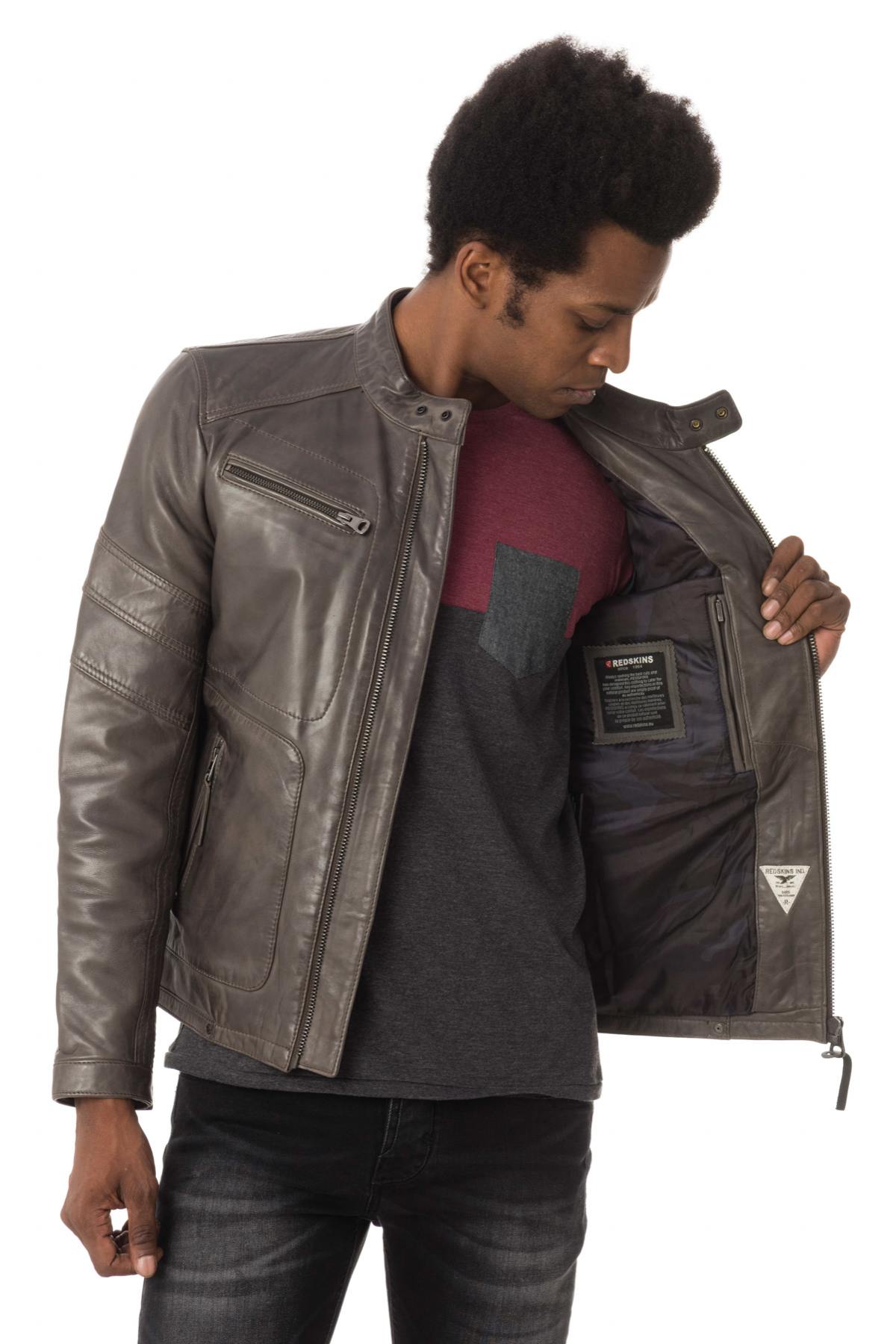 De ronde kraag met zijn 2 drukknopen en het werk van de naden aan de voorkant en aan de zijkant. De jas laat duidelijk het bikerkarakter zien.