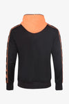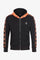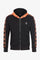 De oranje capuchon heeft een elastisch trekkoord en contrasteert met de achterkant. prachtig met de zwarte kleur van het centrale deel. De randen en geflockte patronen langs de lange mouwen zijn eveneens oranje. De taille en de uiteinden van de mouwen zijn versierd met een brede geribde band wat zorgt voor een goede pasvorm. Aan elke kant zijn twee zakken met ritssluiting aanwezig, terwijl het metalen medaillon van het merk is verguld. aan de zijkant linkerborst.