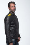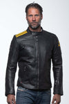 Ontdek karakter en exclusiviteit met de DUFF3 BLACK/BANANA jas voor heren van Classic Legend Motors. Een zwart leren bikerjack van schapenvacht, versterkt met gele strepen, dat de geest van de legendarische 24-uurs races van Le Mans belichaamt.
